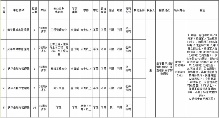 報(bào)名方式:持本人身份證、學(xué)歷證明、退伍證等資料的原件及復(fù)印件、一寸半身免冠近照2張至武平縣城市管理局五樓。
