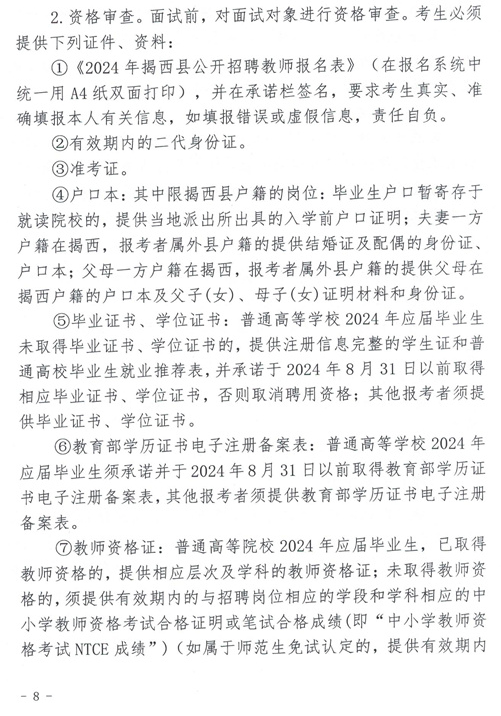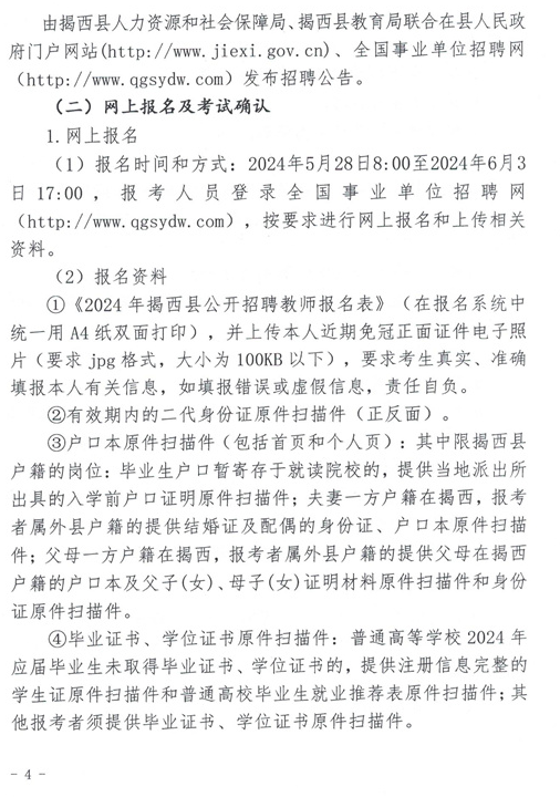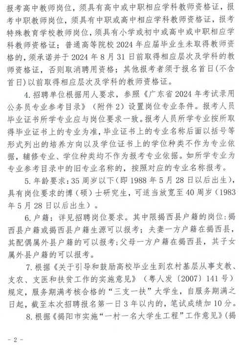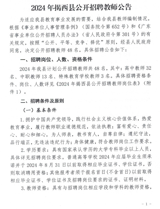 2024年我縣計劃公開招聘教師共48名,其中:高中教師32名、中職教師13名、特殊教育學校教師3名。具體招聘資格條件、崗位、人數(shù)詳見《2024年揭西縣公開招聘教師崗位表》(附件1)。