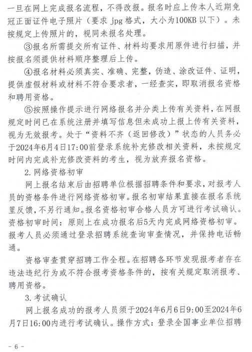 2.學歷要求:具有國家承認學歷的大學專科畢業(yè)以上人員,具體詳見招聘崗位要求。普通高等學校2024年應屆畢業(yè)生須承諾并于2024 年8月31日以前取得相應畢業(yè)證書、學位證書,否則取消聘用資格;其他報考者須于報名首日(不含首日)以前取得相應畢業(yè)證書、學位證書及招聘崗位要求的證書、證明材料。