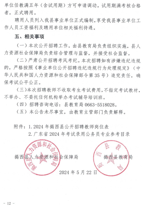 2024-05-22 15:57:40閱讀()揭陽市揭西縣教育局為適應我縣教育事業(yè)發(fā)展的需要,結(jié)合我縣教師編制情況,根據(jù)《事業(yè)單位人事管理條例》(國務院令第652號)和《廣東省事業(yè)單位公開招聘人員辦法》(省人民政府令第301號)的有關規(guī)定,按照“公開、平等、競爭、擇優(yōu)”原則,經(jīng)縣人民政府同意,決定公開招聘教師48名。具體招聘公告如下: