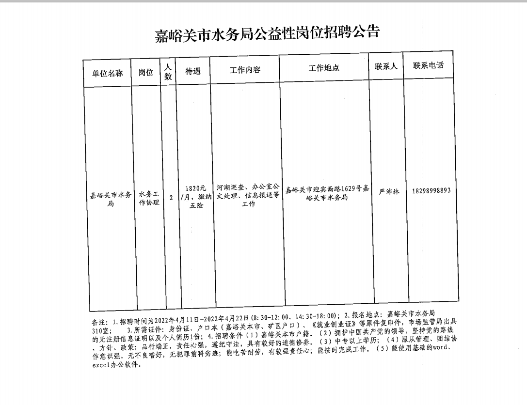 2022年嘉峪關市水務局公益性崗位招聘公告