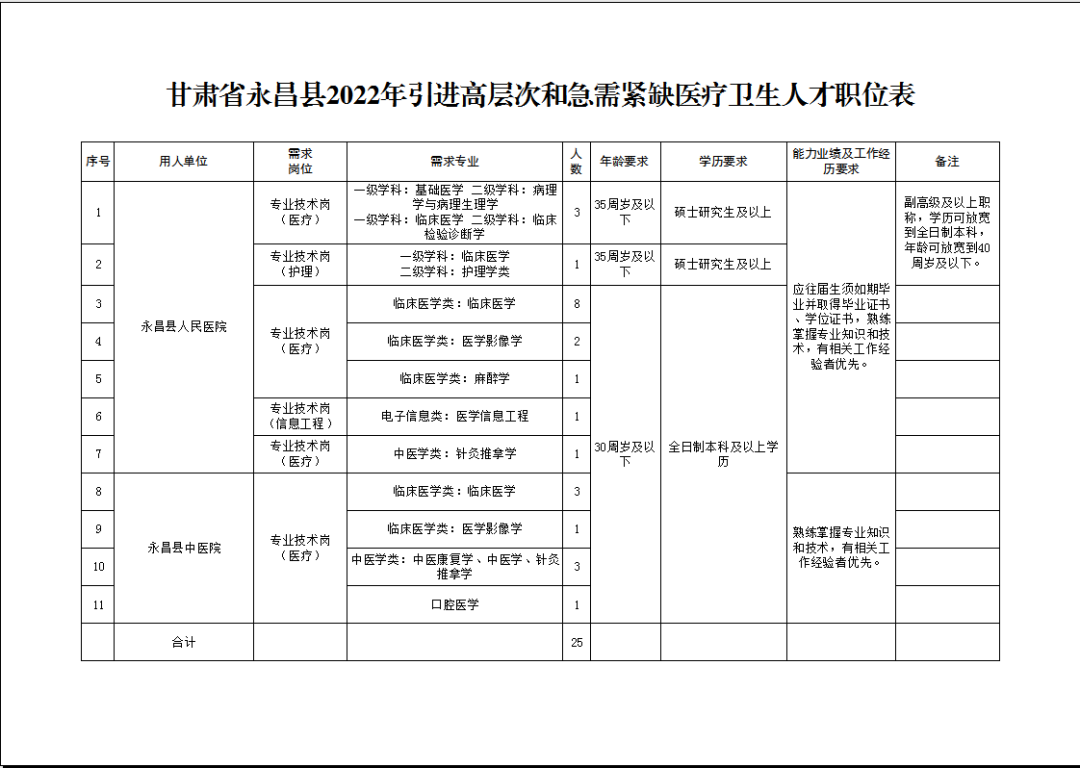 根據(jù)永昌縣醫(yī)療衛(wèi)生單位專業(yè)技術(shù)崗位緊缺實(shí)際,經(jīng)縣委人才工作領(lǐng)導(dǎo)小組、縣委編辦和人社部門審定同意,計(jì)劃為永昌縣衛(wèi)生健康系統(tǒng)面向全國(guó)引進(jìn)高層次和急需緊缺醫(yī)療衛(wèi)生人才25名。