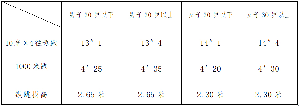 3.體能測(cè)評(píng)上述3個(gè)項(xiàng)目,凡其中一項(xiàng)不達(dá)標(biāo)的,視為體能測(cè)評(píng)不合格,不進(jìn)入體檢程序。