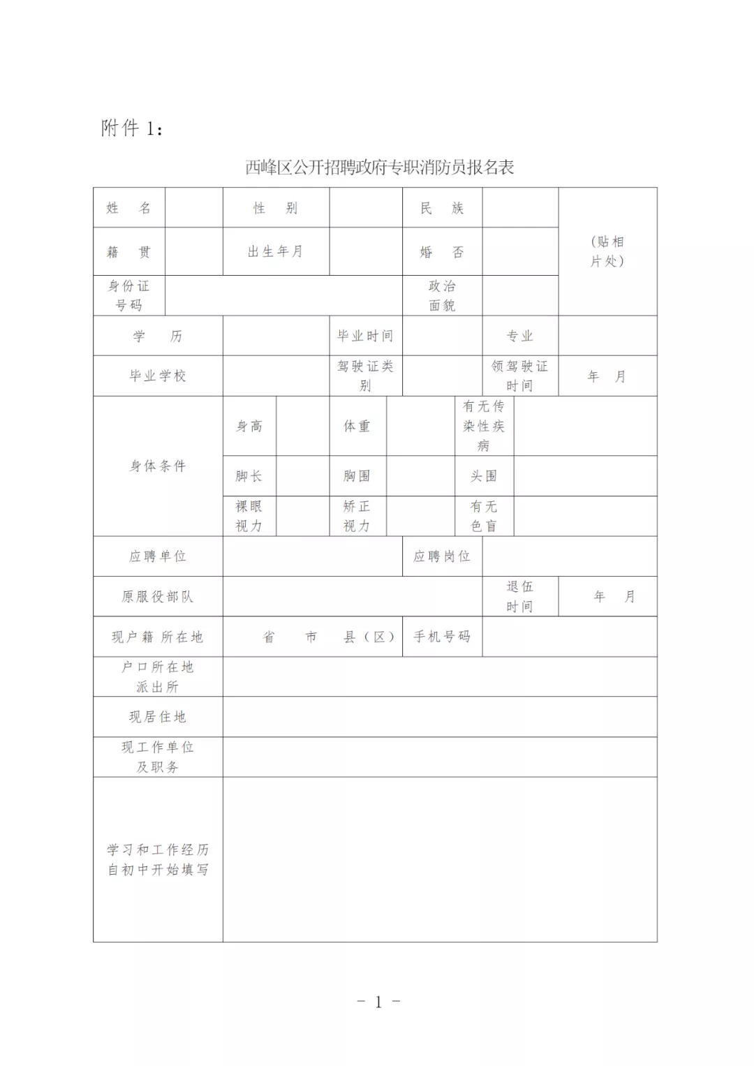 附件1:《西峰區(qū)公開(kāi)招聘政府專(zhuān)職消防員報(bào)名表》