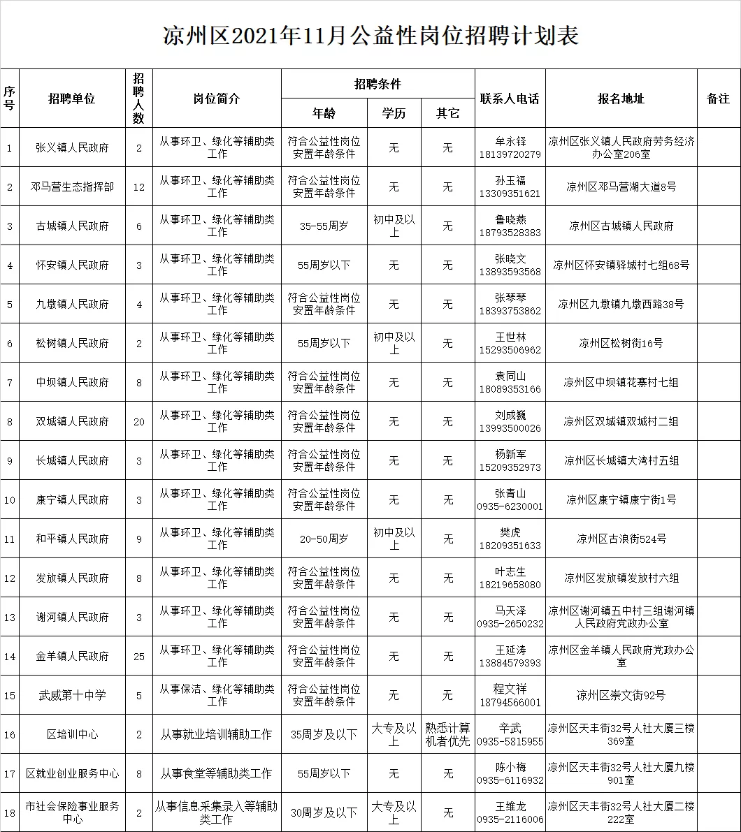 2.報名地點:詳見《涼州區(qū)2021年11月公益性崗位招聘計劃表》;