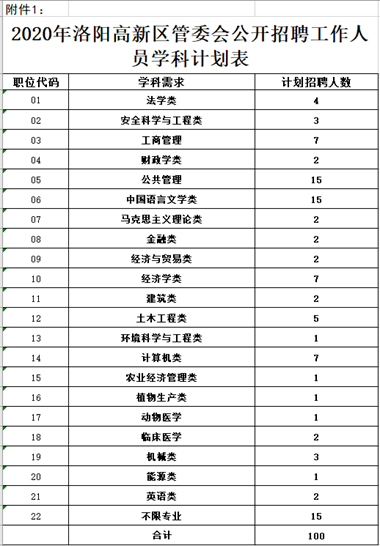 計(jì)劃公開招聘100人,涉及學(xué)科類別21個(gè),另設(shè)一個(gè)不限學(xué)科門類,各學(xué)科的招聘數(shù)量詳見《2020年洛陽高新區(qū)管委會(huì)公開招聘工作人員學(xué)科計(jì)劃表》(附件1),各學(xué)科類別的具體專業(yè)要求詳見《2020年洛陽高新區(qū)管委會(huì)公開招聘工作人員考試學(xué)科分類專業(yè)對(duì)照表》(附件2)。