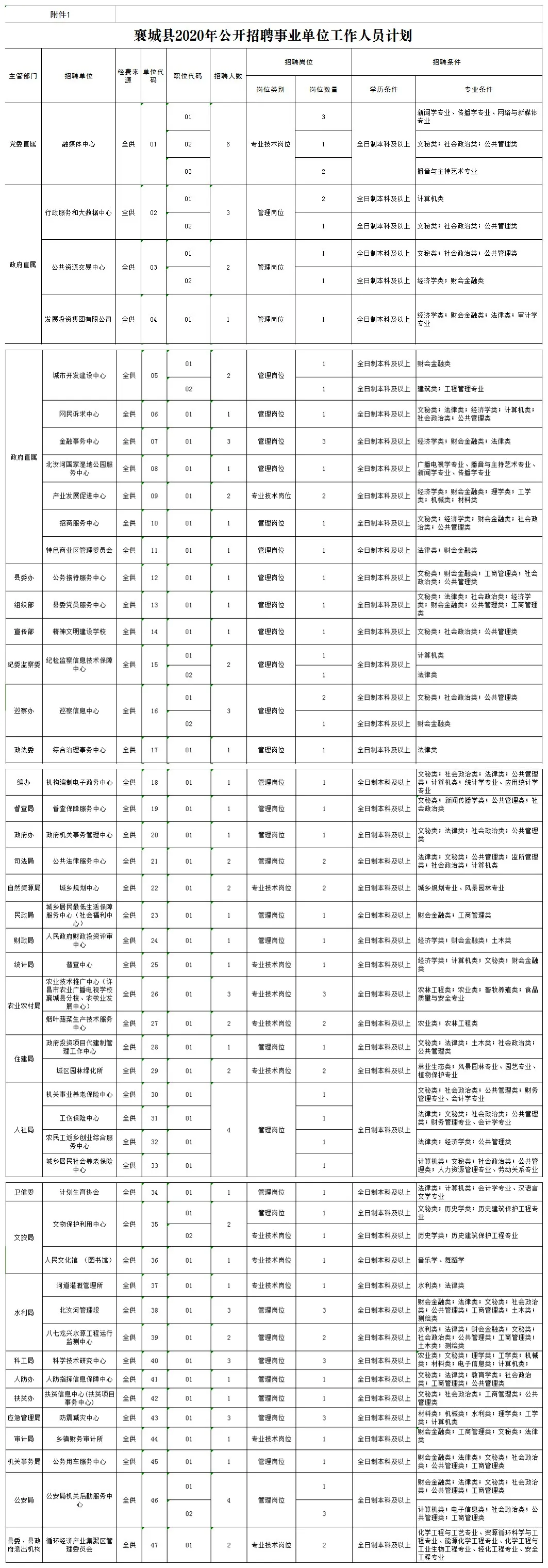 附件:1.襄城縣2020年公開招聘事業(yè)單位工作人員計劃