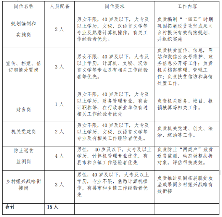 2021-02-01 22:33:25閱讀()襄陽市人力資源和社會保障局襄陽市人民政府扶貧開發(fā)辦公室現(xiàn)委托湖北為盛人力資源開發(fā)有限公司面向社會公開招聘相關(guān)崗位工作人員15名(崗位要求和工作內(nèi)容附后),現(xiàn)將具體事項公告如下: