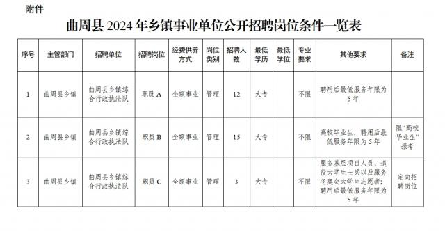 本次招聘崗位為曲周縣鄉(xiāng)鎮(zhèn)全額事業(yè)編制工作人員30名,其中,限“高校畢業(yè)生”報(bào)考崗位15名,定向招聘崗位3名。招聘人數(shù)、具體崗位、資格條件詳見(jiàn)《曲周縣2024年鄉(xiāng)鎮(zhèn)事業(yè)單位公開(kāi)招聘崗位條件一覽表》。