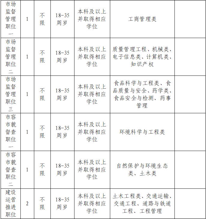 注:1.年齡計(jì)算截止日期為報(bào)名日期。2.綜合執(zhí)法崗,同等條件下優(yōu)先聘用退役軍人、有行政執(zhí)法經(jīng)驗(yàn)者;綜合執(zhí)法崗?fù)獾钠渌毼?,同等條件下優(yōu)先聘用具備1年及以上相關(guān)從業(yè)經(jīng)驗(yàn)者。