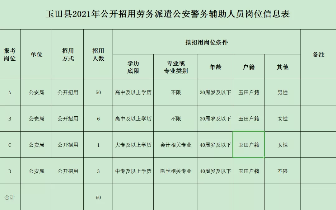 公開(kāi)招用勞務(wù)派遣公安警務(wù)輔助人員60人,其中男性50人,女性7人,不限3人。