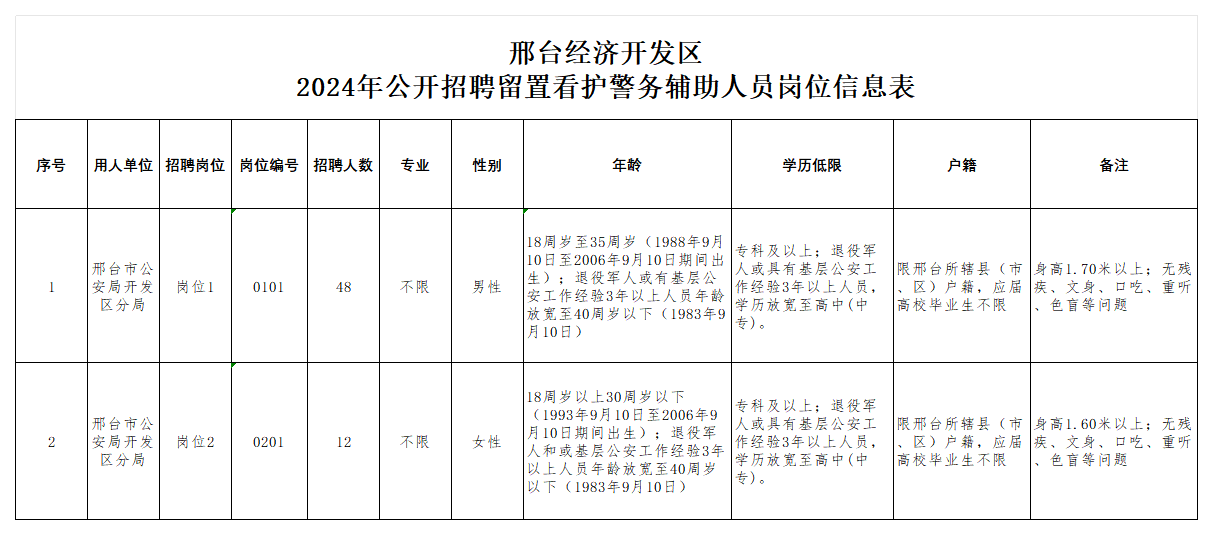 2024年邢臺經(jīng)濟開發(fā)區(qū)公開招聘留置看護警務(wù)輔助人員公告