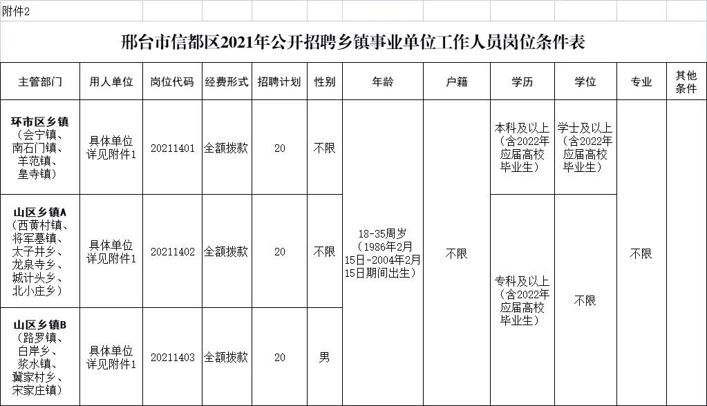 1.招聘崗位所需的具體條件詳見《邢臺(tái)市信都區(qū)2021年公開招聘鄉(xiāng)鎮(zhèn)事業(yè)單位工作人員崗位條件表》(附件2);
