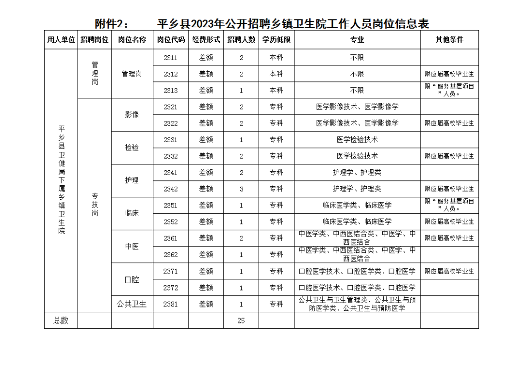 公開招聘鄉(xiāng)鎮(zhèn)衛(wèi)生院工作人員25名。其中:管理崗5名,專技崗20名。詳見《平鄉(xiāng)縣2023年公開招聘鄉(xiāng)鎮(zhèn)衛(wèi)生院工作人員崗位計劃表》(附件1),《平鄉(xiāng)縣2023年公開招聘鄉(xiāng)鎮(zhèn)衛(wèi)生院工作人員崗位信息表》(附件2)。