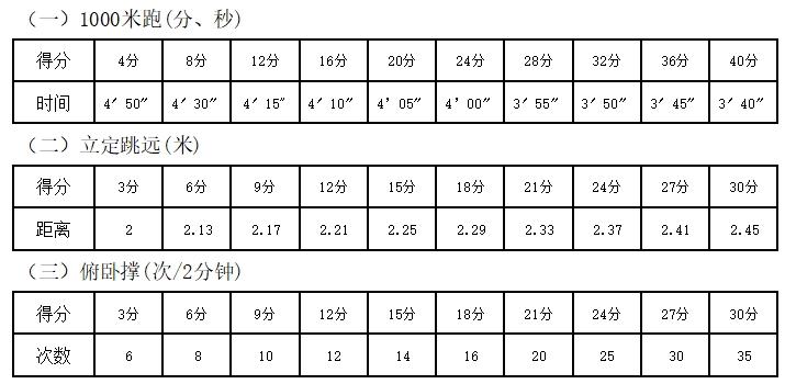 測(cè)試科目為1000米跑、立定跳遠(yuǎn)、俯臥撐,總成績(jī)100分。