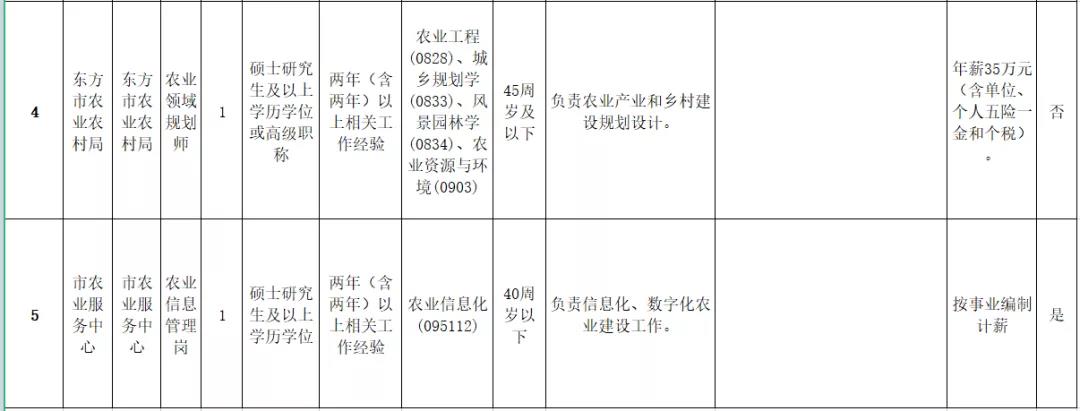 本次招聘急需緊缺人才共5名,其中納入編制管理1名。市工科信局信息化工程師1名、工業(yè)經(jīng)濟(jì)運(yùn)行分析師1名;市農(nóng)業(yè)農(nóng)村局高級(jí)農(nóng)藝師1名、農(nóng)業(yè)領(lǐng)域規(guī)劃師1名;市農(nóng)業(yè)服務(wù)中心農(nóng)業(yè)信息管理崗1名(納入編制管理)。具體崗位要求詳見(jiàn)《東方市2021年招聘急需緊缺人才(第一批)崗位表》(附件1)。