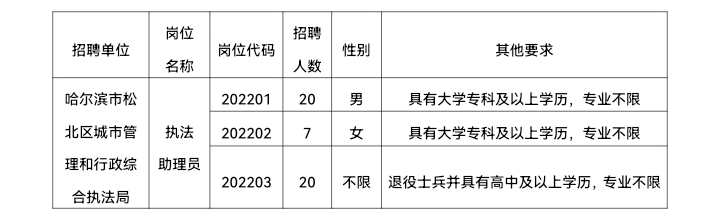2022-09-06 21:42:54閱讀()哈爾濱市松北區(qū)人民政府為進(jìn)一步加強(qiáng)哈爾濱新區(qū)疫情防控和綜合行政執(zhí)法力量,哈爾濱市松北區(qū)城市管理和行政綜合執(zhí)法局面向社會(huì)公開招聘執(zhí)法助理員。公告如下: