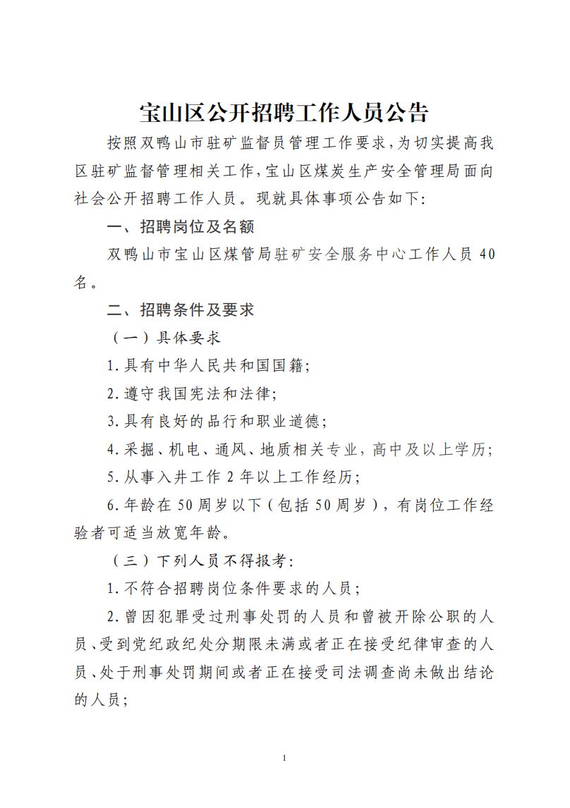 2024-01-27 22:43:14閱讀()雙鴨山市寶山區(qū)人民政府按照雙鴨山市駐礦監(jiān)督員管理工作要求,為切實(shí)提高我區(qū)駐礦監(jiān)督管理相關(guān)工作,寶山區(qū)煤炭生產(chǎn)安全管理局面向社會公開招聘工作人員?,F(xiàn)就具體事項(xiàng)公告如下: