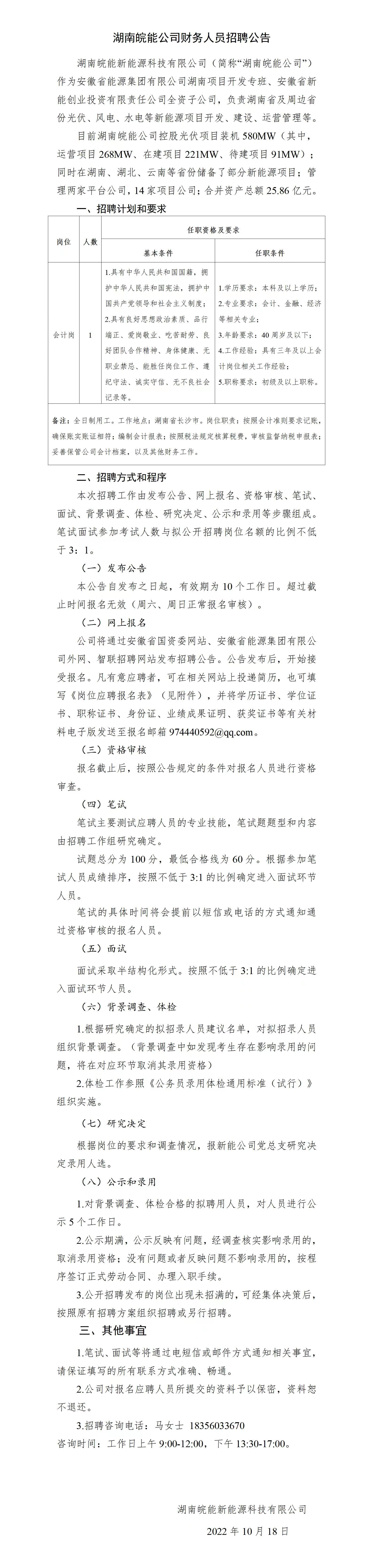2022年湖南皖能公司財務人員招聘公告