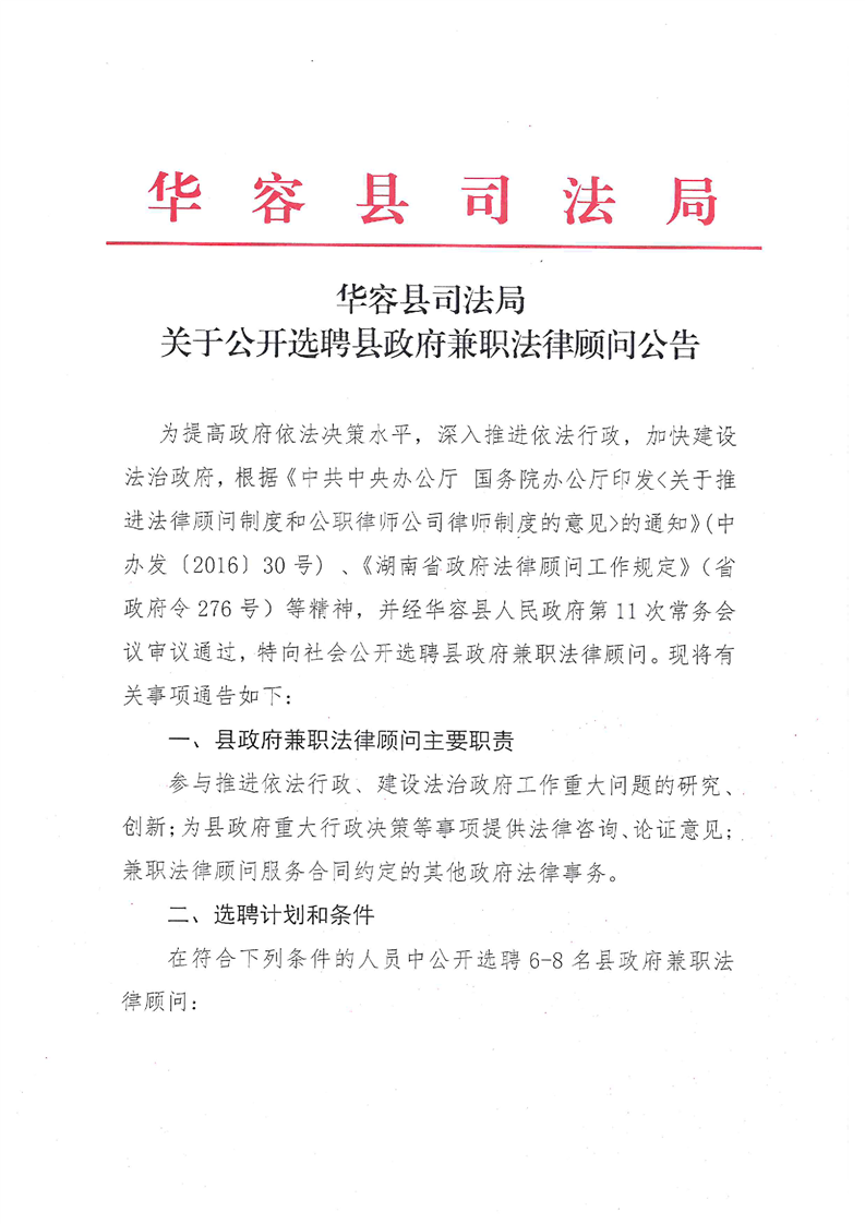 2022-09-14 11:05:00閱讀()華容縣人民政府華容縣司法局關(guān)于公開選聘縣政府兼職法律顧問公告