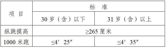 2.體能測評項目及標準。本次招聘體能測評共兩項:縱跳摸高、1000米跑。體能測評參照《公安機關(guān)錄用人民警察體能測評項目和標準(暫行)》執(zhí)行。