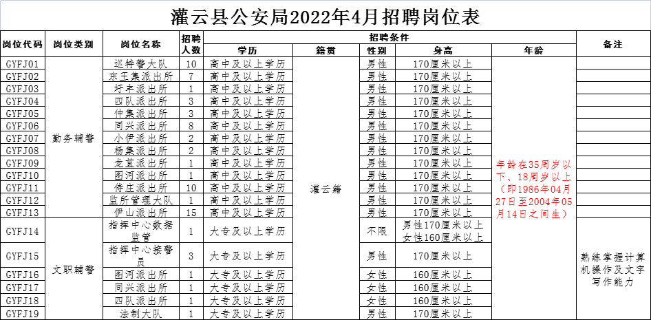 本次所招聘的警務輔助人員,是指為公安機關日常運轉和警務活動提供輔助支持的非人民警察身份且非事業(yè)編制身份人員。具體崗位及招聘條件等詳見《灌云縣公安局2022年4月招聘崗位表》,可在灌云縣人民政府網(http://www.guanyun.gov.cn/gyxzf/gsgg/gsgg.html)公示公告欄查詢。