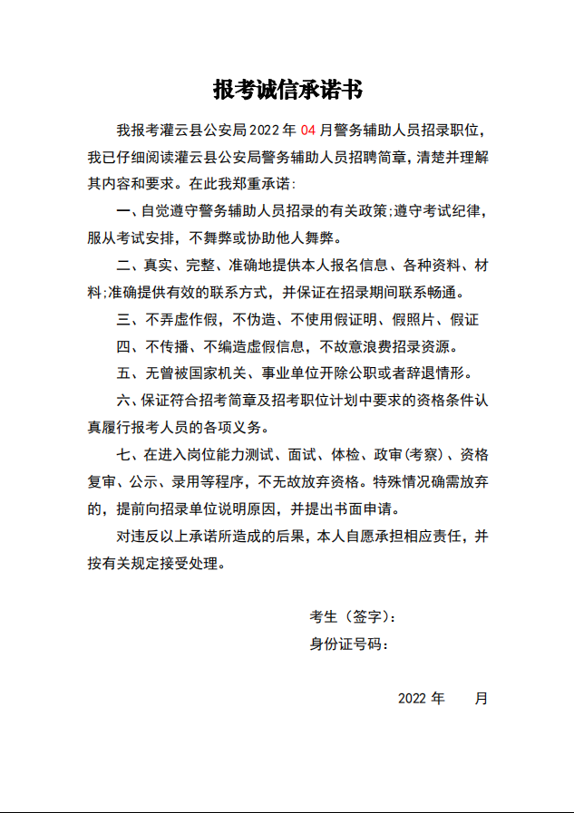 應聘人員須按照應聘崗位要求,真實、準確、完整和規(guī)范填寫報名表、報考誠信承諾書,連同應聘崗位所需有關證明材料電子版(可以是PDF、JPEG、JPG等形式),發(fā)送至郵箱:gygazp@126.com,郵件主題為:“應聘崗位代碼+姓名+聯系電話”。郵件接收成功后,將于48小時內回復資格初審意見,如未收到資格初審意見,請及時與灌云縣公安局聯系,聯系電話:0518-81868627。