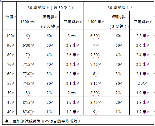 (2)體能測試滿分100分,達(dá)到60分合格,不滿60分取消資格。得分按比例折算入總成績。