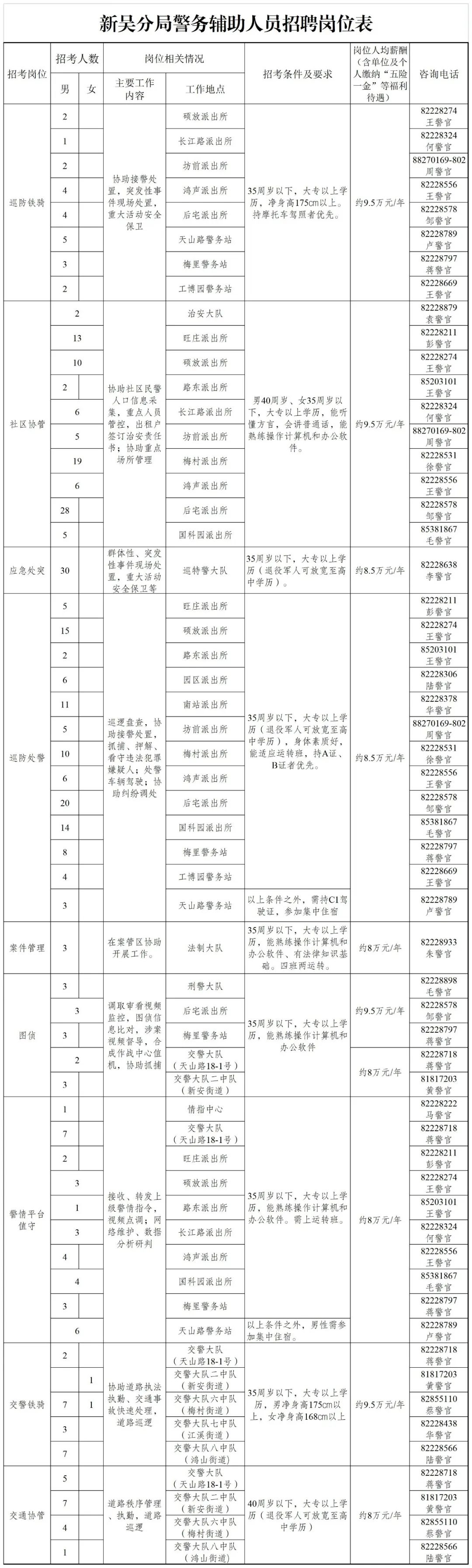 2023-05-14 23:46:56閱讀()新吳區(qū)人民政府因公安工作需要,新吳公安分局決定面向社會公開招聘警務(wù)輔助人員(非人民警察身份且非事業(yè)編制人員身份)347名,現(xiàn)將有關(guān)事項公告如下: