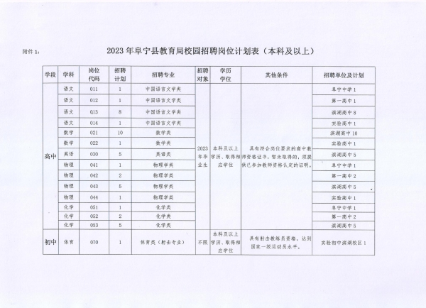 1.2023年阜寧縣教育局校園招聘崗位計劃表(本科及以上)