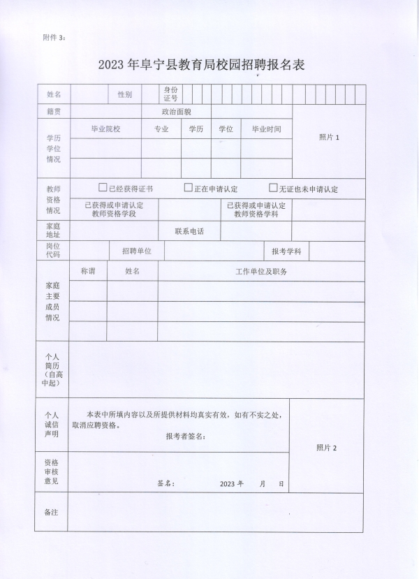 3.2023年阜寧縣教育局校園招聘報名表
