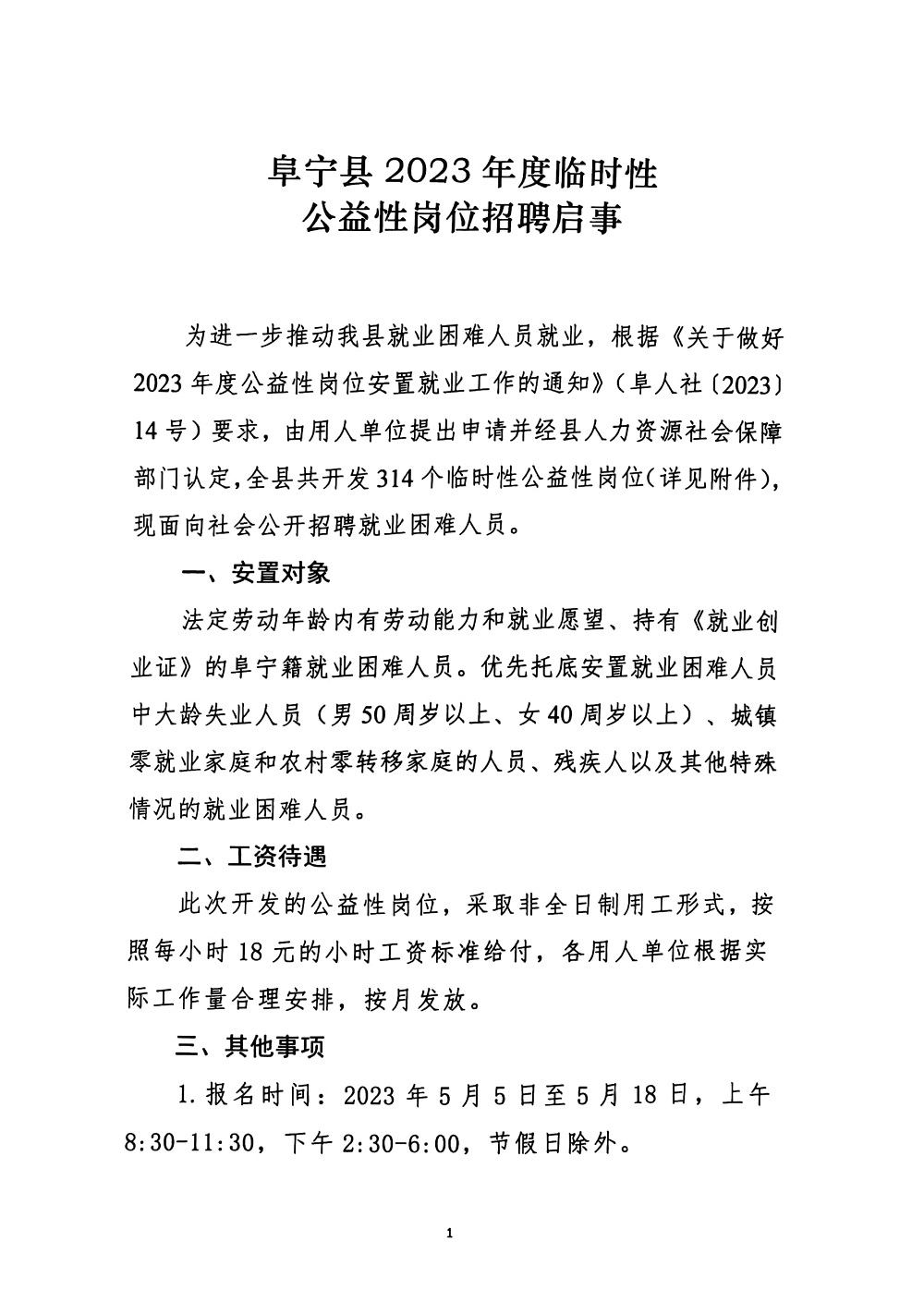 2023-05-06 16:23:32閱讀()阜寧縣人民政府為進(jìn)一步推動我縣就業(yè)困難人員就業(yè),根據(jù)《關(guān)于做好2023年度公益性崗位安置就業(yè)工作的通知》(阜人社〔2023)14號)要求,由用人單位提出申請并經(jīng)縣人力資源社會保障部門認(rèn)定,全縣共開發(fā)314個臨時性公益性崗位(詳見附件),現(xiàn)面向社會公開招聘就業(yè)困難人員。