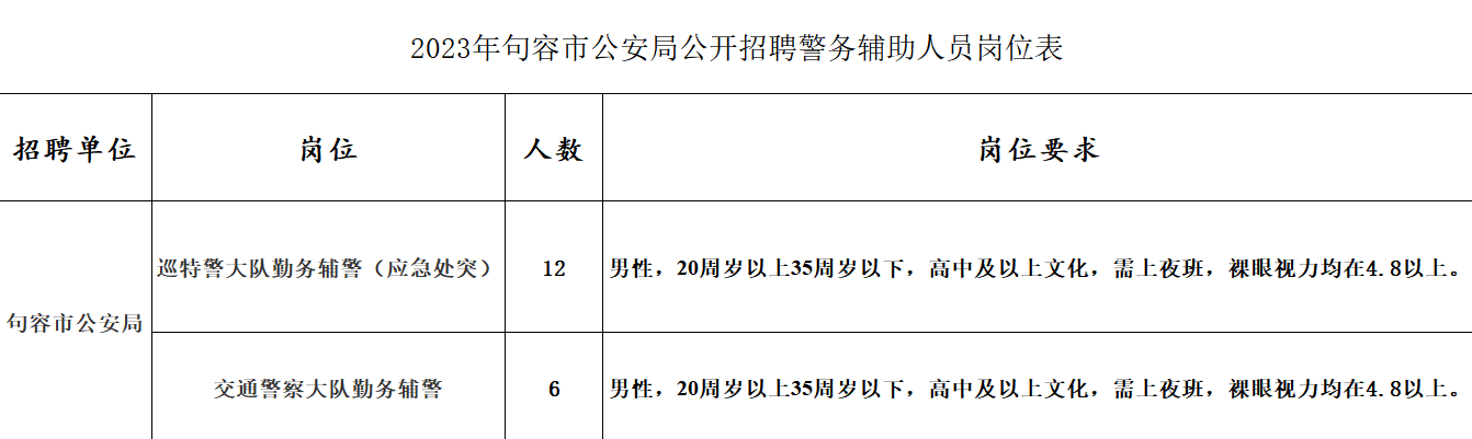 5.招聘崗位、人數(shù)和所要求的年齡、性別、學(xué)歷、身體條件等資格條件詳見(jiàn)《2023年句容市公安局公開(kāi)招聘警務(wù)輔助人員崗位表》(附件1)。