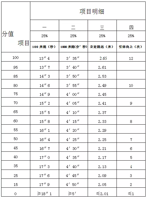 (3)測試項目:1000米跑、100米跑、立定跳遠(yuǎn)、引體向上各占25分的權(quán)重分值(評分標(biāo)準(zhǔn)見附件二)。