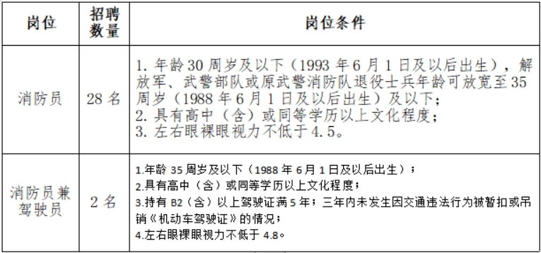 招聘崗位為區(qū)專業(yè)森林消防大隊(duì)合同制隊(duì)員30名,其中消防員28名(報(bào)名人數(shù)須達(dá)到1:1.5以上,否則按照比例減少招聘人數(shù)),消防員兼駕駛員2名(報(bào)名人數(shù)須達(dá)到1:2以上,否則按比例減少招聘人數(shù))。