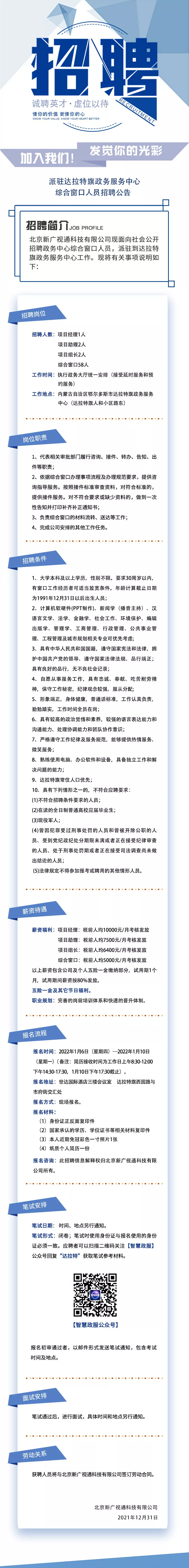 2022-01-07 00:41:59閱讀()鄂爾多斯公共招聘網(wǎng)2022年鄂爾多斯達拉特旗政務(wù)服務(wù)中心綜窗人員招聘公告