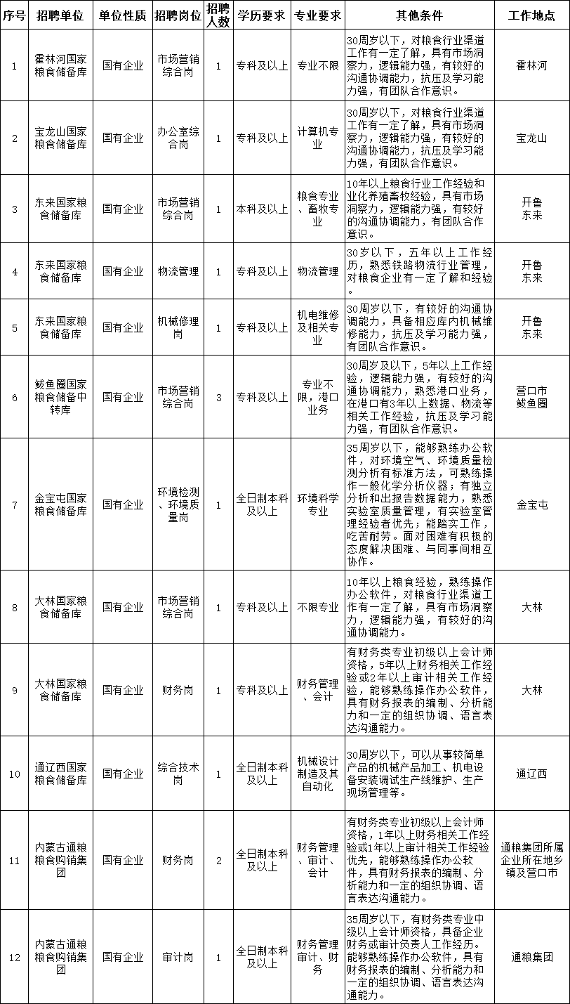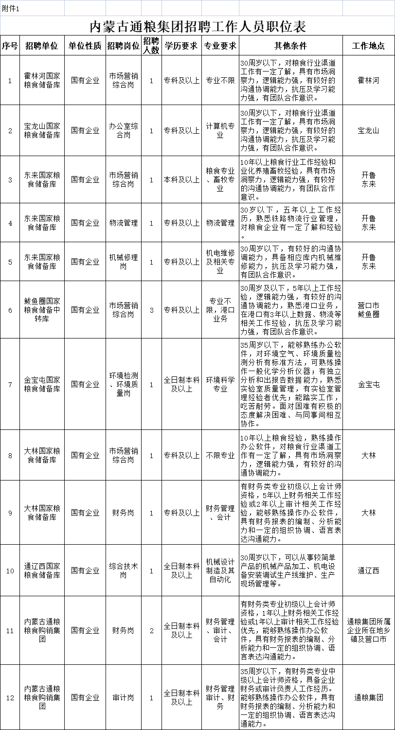 內(nèi)蒙古通糧集團(tuán)招聘工作人員職位表