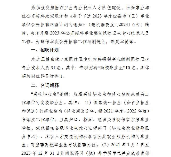 本次正鑲白旗7家醫(yī)療衛(wèi)生機(jī)構(gòu)共招聘事業(yè)編制醫(yī)療衛(wèi)生專業(yè)技術(shù)人員31名,其中:專項(xiàng)招聘“高校畢業(yè)生”10名。具體招聘崗位詳見附件1。