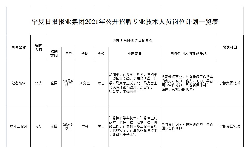 崗位要求詳見《寧夏日報報業(yè)集團2021年公開招聘專業(yè)技術(shù)人員崗位計劃一覽表》(附件)。