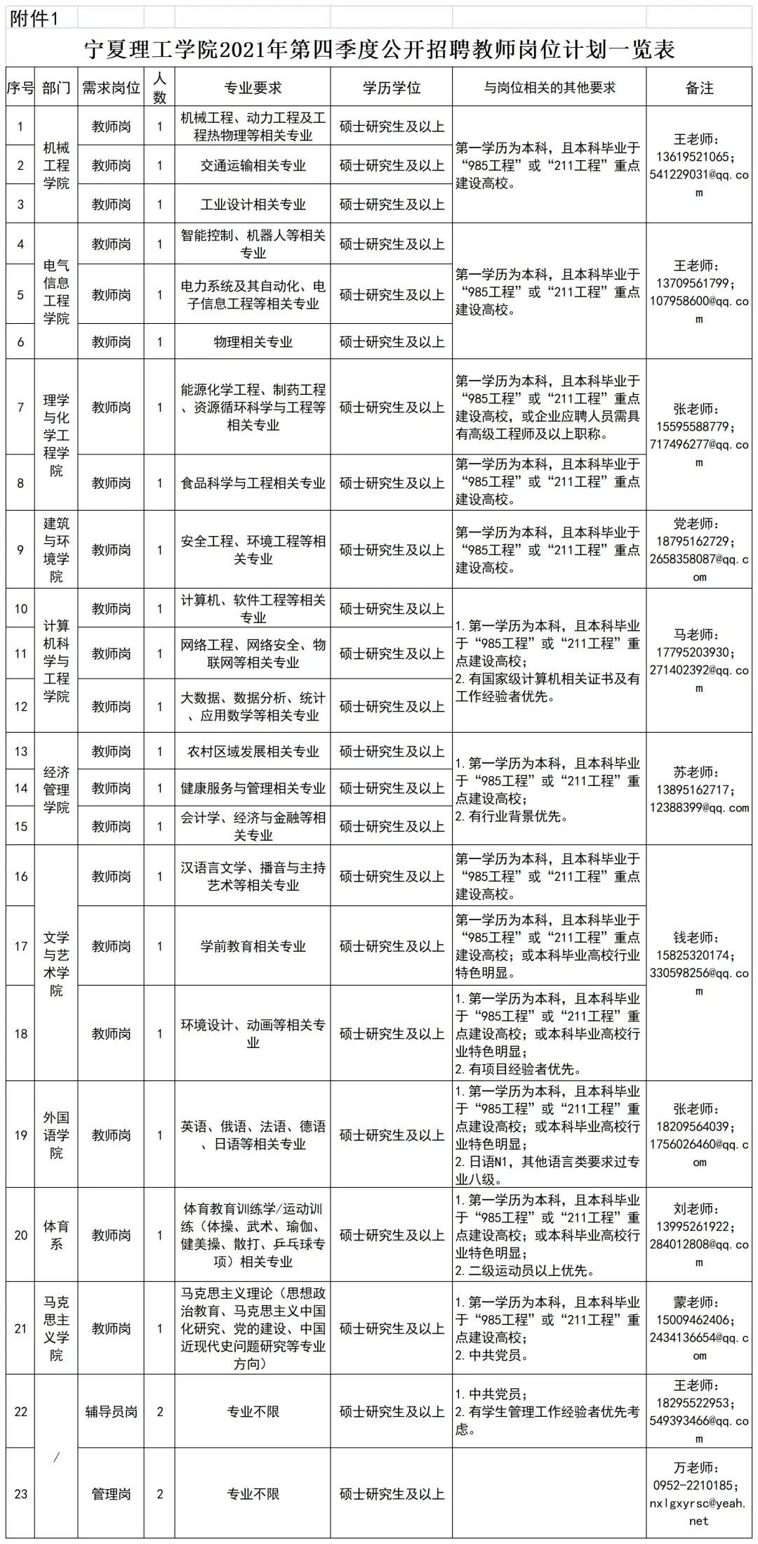 具體詳見《寧夏理工學(xué)院2021年第四季度公開招聘教師崗位計劃一覽表》(見附件1)。