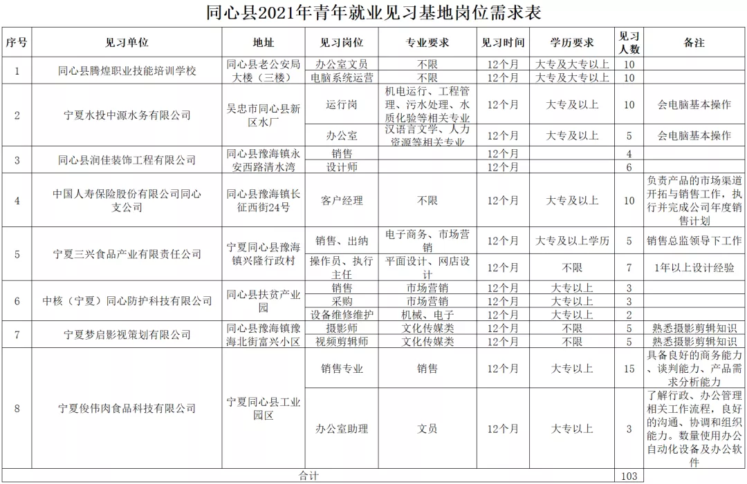 附件1:同心縣2021年青年就業(yè)見習(xí)基地崗位需求表