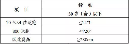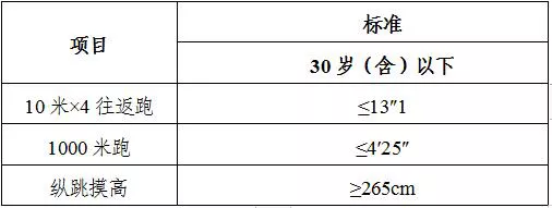 (二)體能測評的內(nèi)容和要求。體能測評參照《公安機關(guān)錄用人民警察體能測評項目和標準(暫行)》(人社部發(fā)〔2011〕48號)、國家公務員局《關(guān)于明確公安機關(guān)人民警察體能測評次數(shù)的函》(國公局函〔2012〕1號)相關(guān)要求執(zhí)行。共設(shè)三項:男子1000米跑和女子800米跑(測評次數(shù)均為1次)、10米×4往返跑(測評次數(shù)不超過2次)、縱跳摸高(測評次數(shù)不超過3次)。體能測評的三個項目中有任何一項不合格或違規(guī),視為體能測評不合格。
