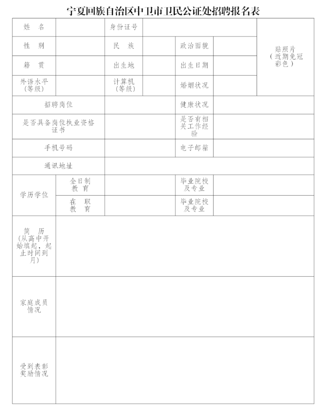 4.填寫《寧夏回族自治區(qū)中衛(wèi)市衛(wèi)民公證處招聘報名表》。