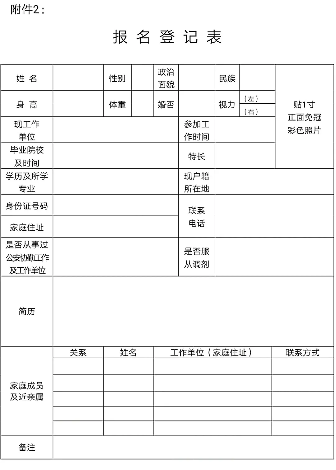 (三)報名要求:報名人員填寫《報名登記表》(附件2)、《應(yīng)聘誠信承諾書》(附件3),持本人有效期內(nèi)身份證、戶口本、國家承認的學(xué)歷證書、個人信用報告、其他相關(guān)特長證明報名,退役軍人持退出現(xiàn)役證(以上材料均須原件和復(fù)印件,大專及以上學(xué)歷的請出具學(xué)信網(wǎng)《教育部學(xué)歷證書電子備案表》)。報名時,交近期1寸同底免冠彩色照片3張(照片背面寫上個人姓名)。