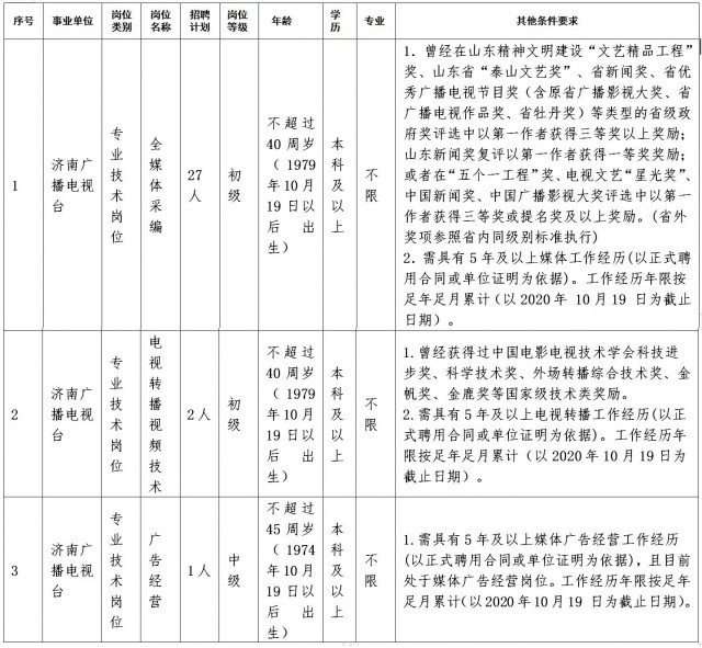 根據(jù)事業(yè)發(fā)展需要,濟南廣播電視臺擬面向社會公開招聘專業(yè)技術崗位工作人員30人,均為事業(yè)編制。