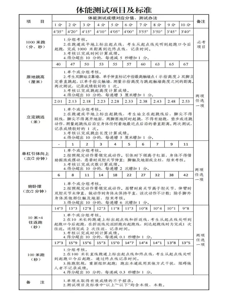 01體能、體型測試:標(biāo)準(zhǔn)參照《國家綜合性消防救援隊(duì)伍消防員招錄體能測試、崗位適應(yīng)性測試項(xiàng)目及標(biāo)準(zhǔn)》執(zhí)行。考核項(xiàng)目為:1000米跑必考項(xiàng);原地跳高、立定跳遠(yuǎn),兩項(xiàng)選一項(xiàng);單杠引體向上、俯臥撐,兩項(xiàng)選一項(xiàng);10米×4往返跑、100米跑兩項(xiàng)選一項(xiàng)。主要考察招收對象肌肉力量、肌肉耐力和爆發(fā)力等。