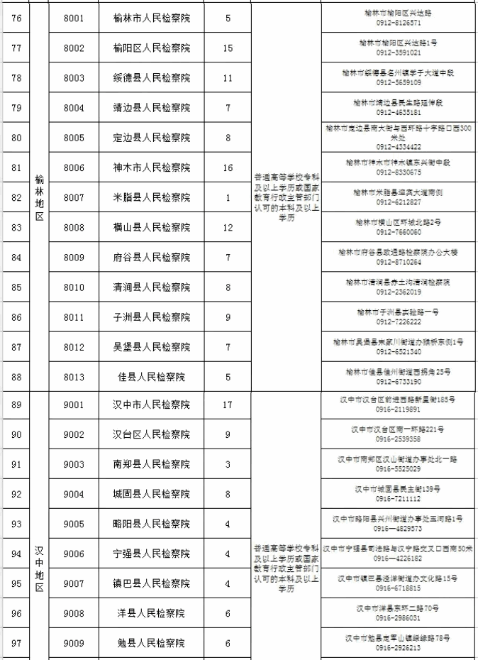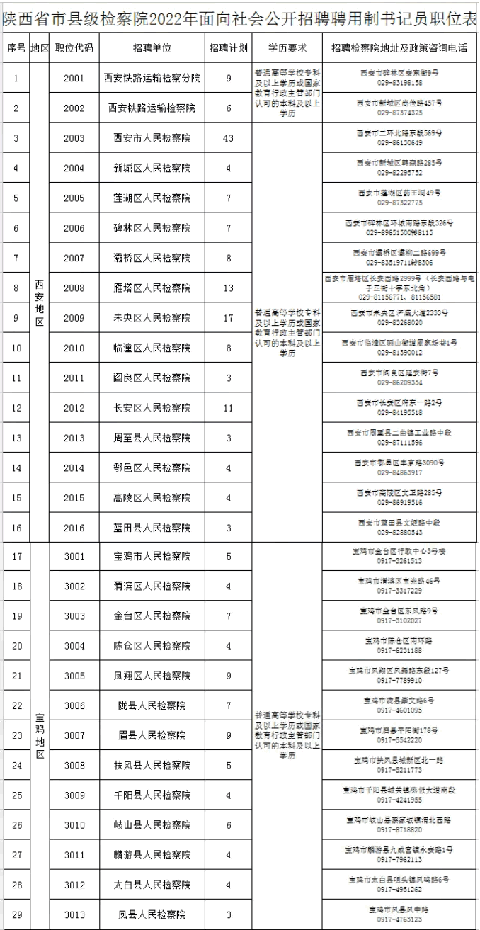 陜西省市縣級檢察院2022年面向社會公開招聘聘用制書記員職位表