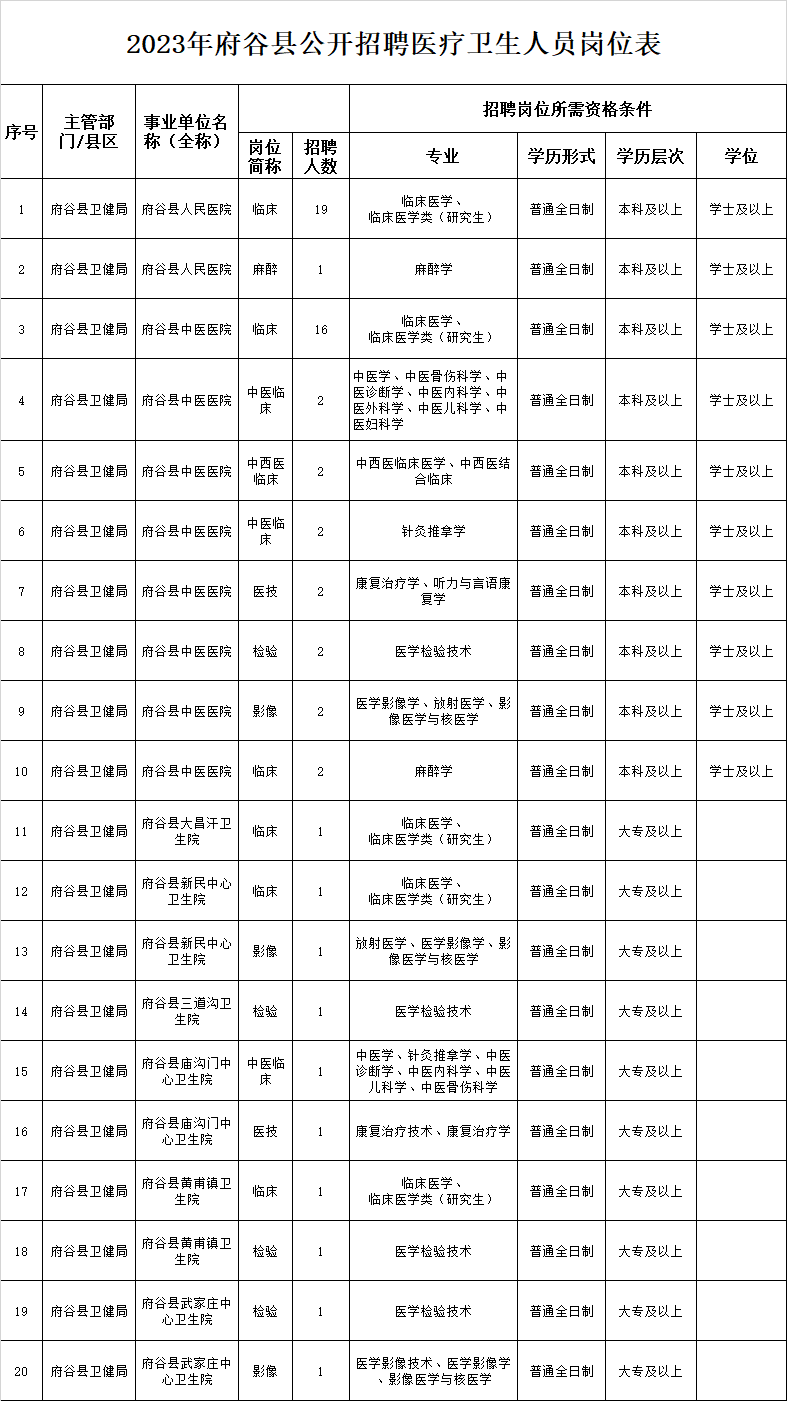 4.符合招聘崗位要求的學(xué)歷、學(xué)位和專業(yè)等條件(詳見(jiàn)附件:《2023年府谷縣公開(kāi)招聘醫(yī)療衛(wèi)生人員崗位表》);