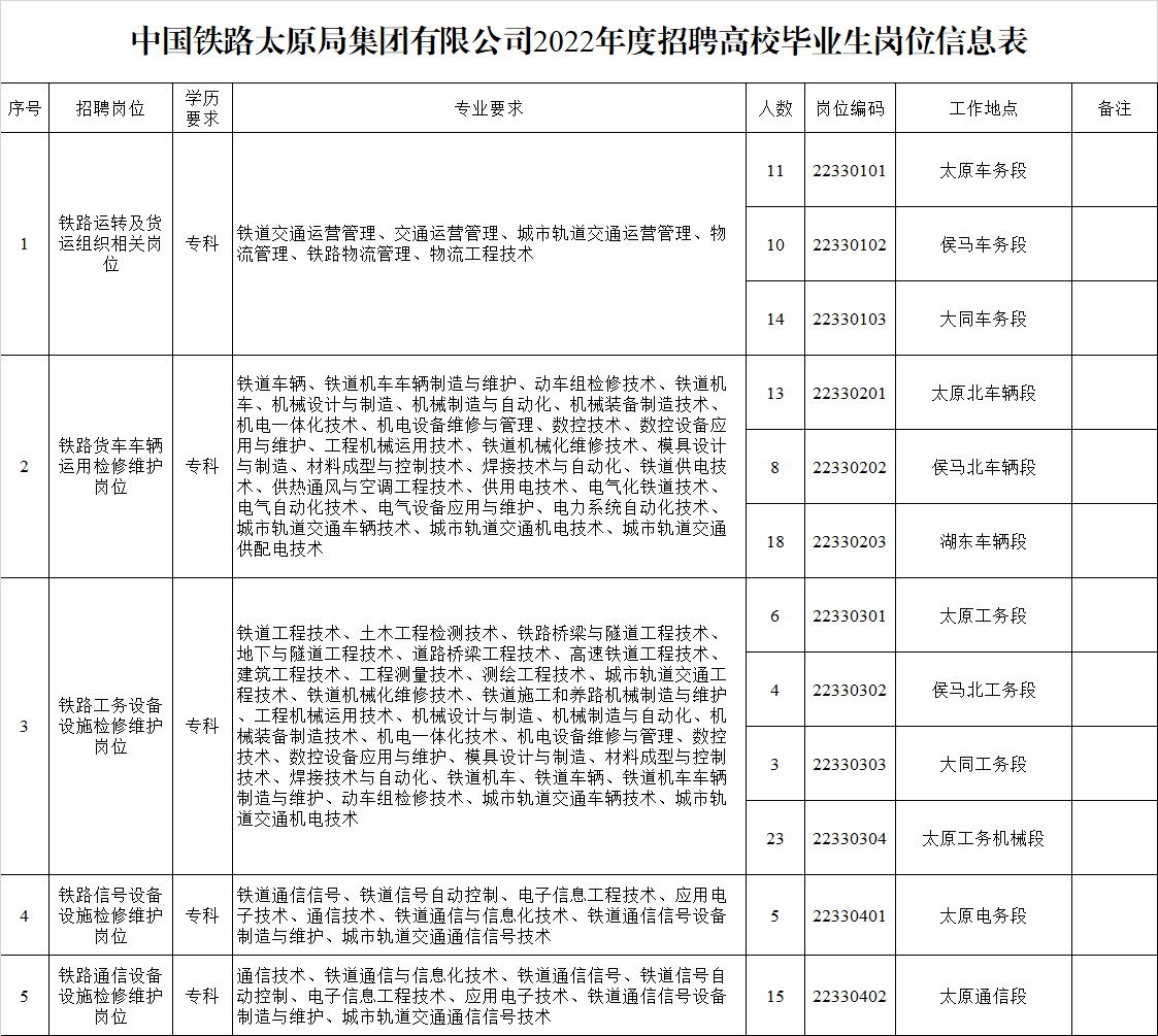 招聘崗位、學(xué)歷、專業(yè)、人數(shù)和工作單位等內(nèi)容詳見《中國鐵路太原局集團有限公司2022年度招聘高校畢業(yè)生崗位信息表》。