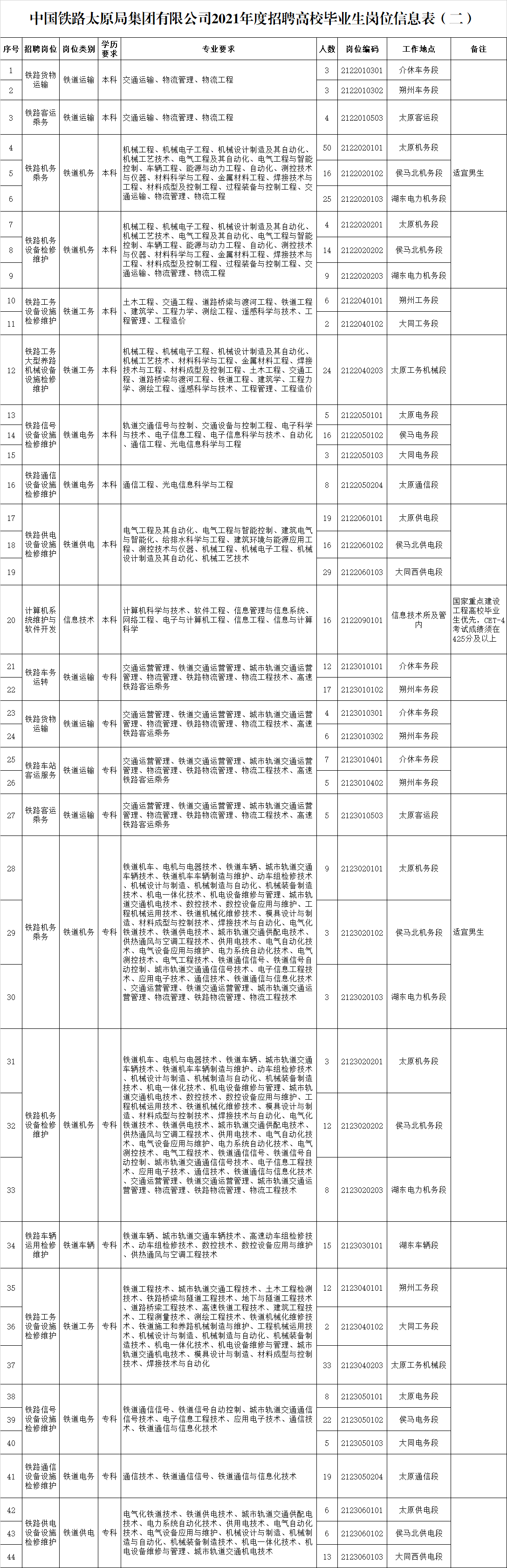 招聘崗位、學歷、專業(yè)、人數和工作地點等內容詳見《中國鐵路太原局集團有限公司2021年度招聘高校畢業(yè)生崗位信息表(二)》。